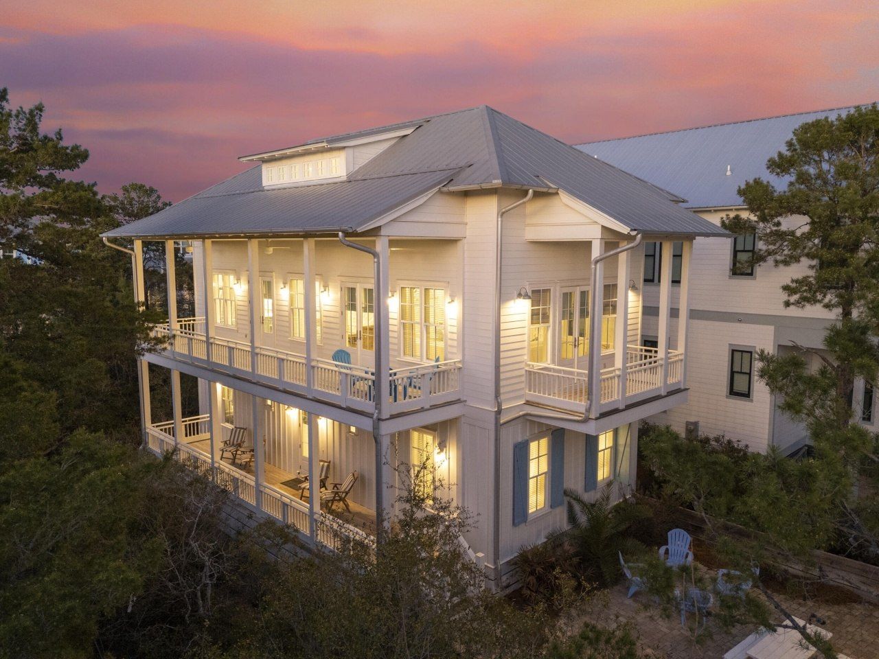 Designed by renowned architect Tom Christ of Christ & Associates and expertly built by Artisan, this beautifully crafted 4BR/4BA cottage-style residence is nestled in Blue Mountain, right off 30A. A 1BR/1BA carriage house sits in front of the 3BR/3BA main home, creating a private courtyard between the two structures for a peaceful, secluded feel.The main home features expansive covered porches perfect for relaxing, while the carriage house adds its own private balcony. Inside the main residence, the reverse floor plan offers a spacious master suite and guest suite on the ground floor, welcoming you with shiplap accents and durable stone flooring?ideal for beach living.On the second level, an open-concept living and dining space is bathed in natural light, complemented by tongue-and-groove ceilings, wide-plank hardwood floors, and a calming neutral palette. The fully equipped kitchen stands out with premium Caesarstone and LG Hausys quartz countertops, a large center island, stainless steel appliances, white cabinetry, and a striking subway tile backsplash that stretches to the ceiling. A guest bathroom featuring a soaking tub completes this floor.The third level offers a spacious bedroom that doubles as an ideal entertainment area. With its generous size, this versatile space is perfect for hosting guests, creating a cozy media room, or adding built-in bunks for additional sleeping arrangements.Above the two-car garage, the carriage house serves as an ideal guest retreat with its own kitchen, separate living room, bedroom, and full bathroom. Connecting both structures, a charming brick-paved courtyard provides plenty of space for outdoor livingor even a potential plunge pool addition.Just steps from the community's resort-style amenitiesincluding a swimming pool, hot tub, gas fire pit, covered entertainment pavilion, and an observation tower with stunning Gulf viewsthis property offers endless possibilities. Whether you're looking for a private family retreat or an income-producing rental opportunity, this Blue Mountain Beach gem delivers exceptional potential in an unbeatable location. The home is sold furnished.